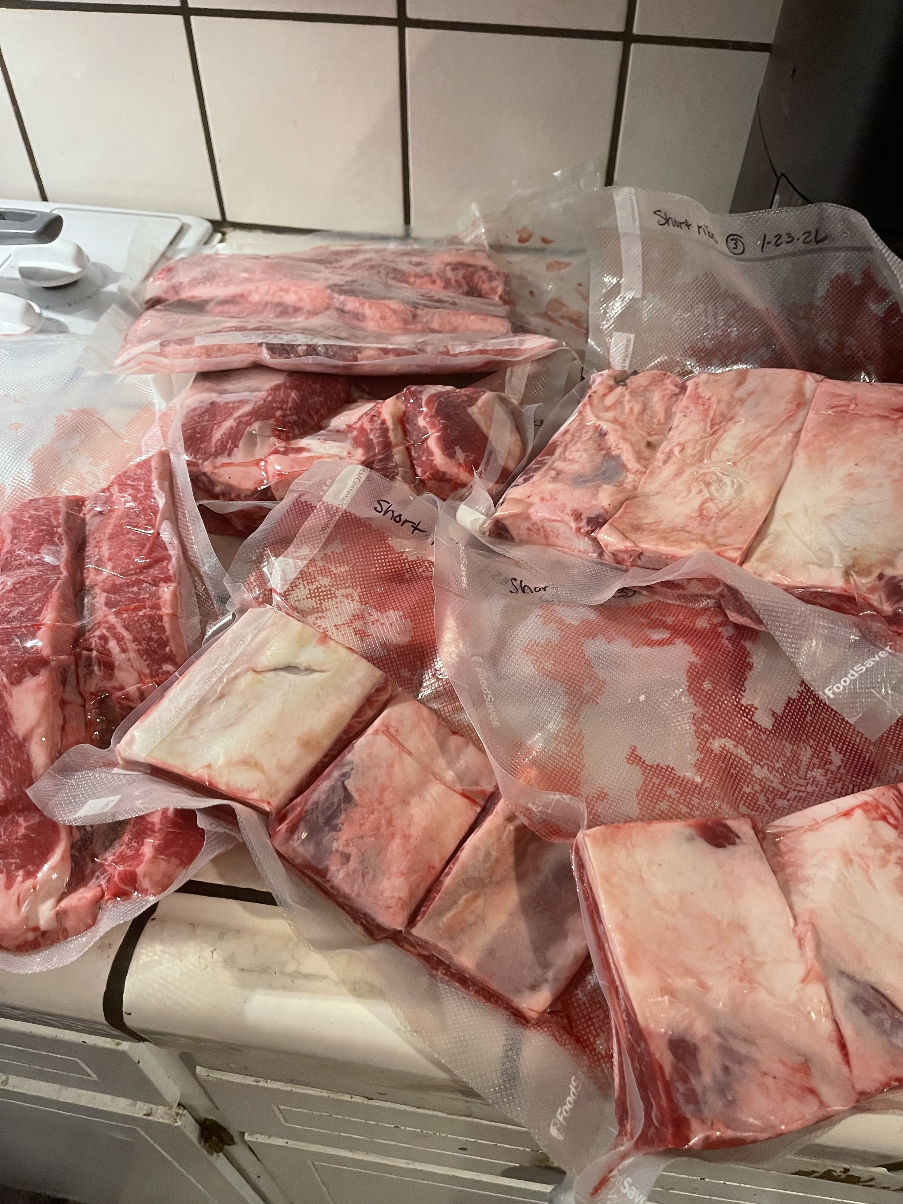 Then another local store was offering short ribs for $5/# so I picked up 4 packs, again limited to 4 packs. Then I used my daughters discount card and went to a different store and got 4 more packs plus they were also offering flankin ribs at $5/#.