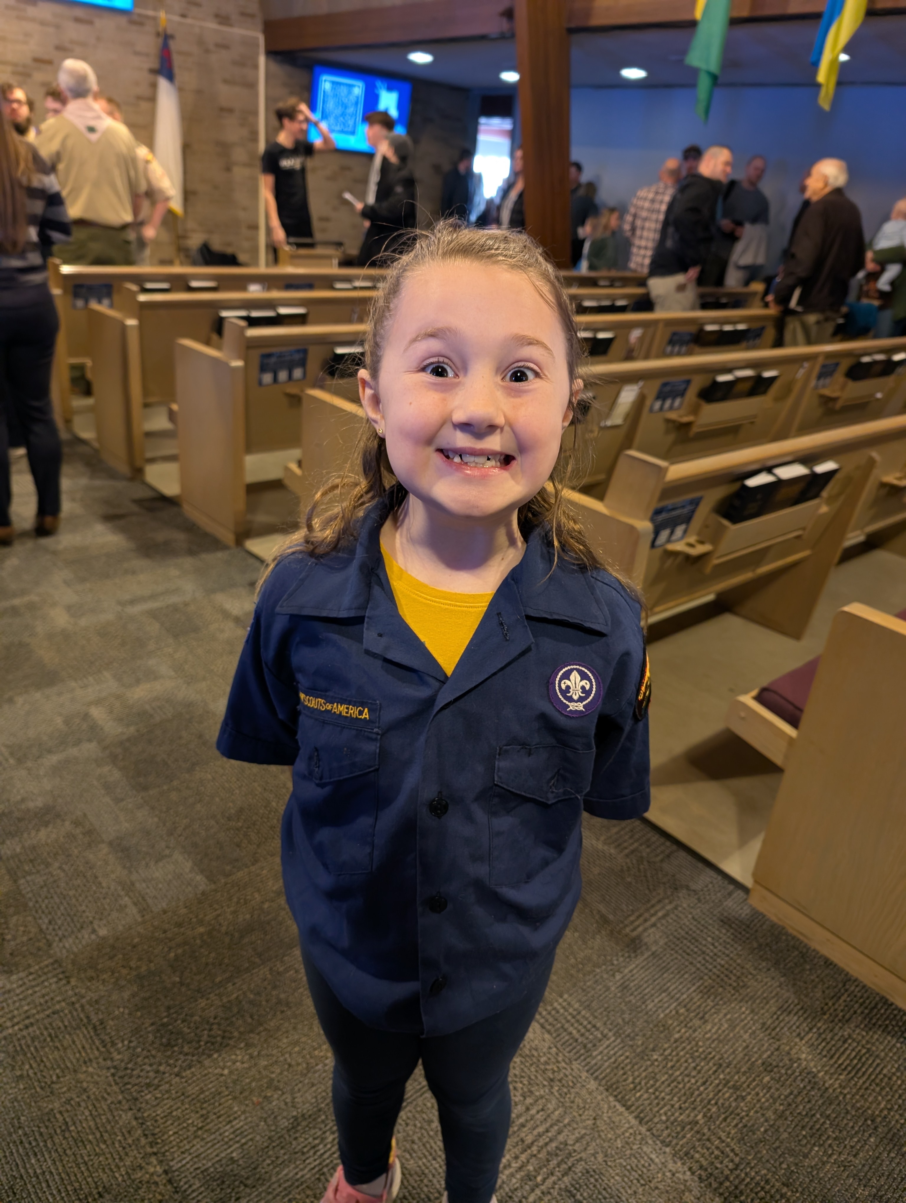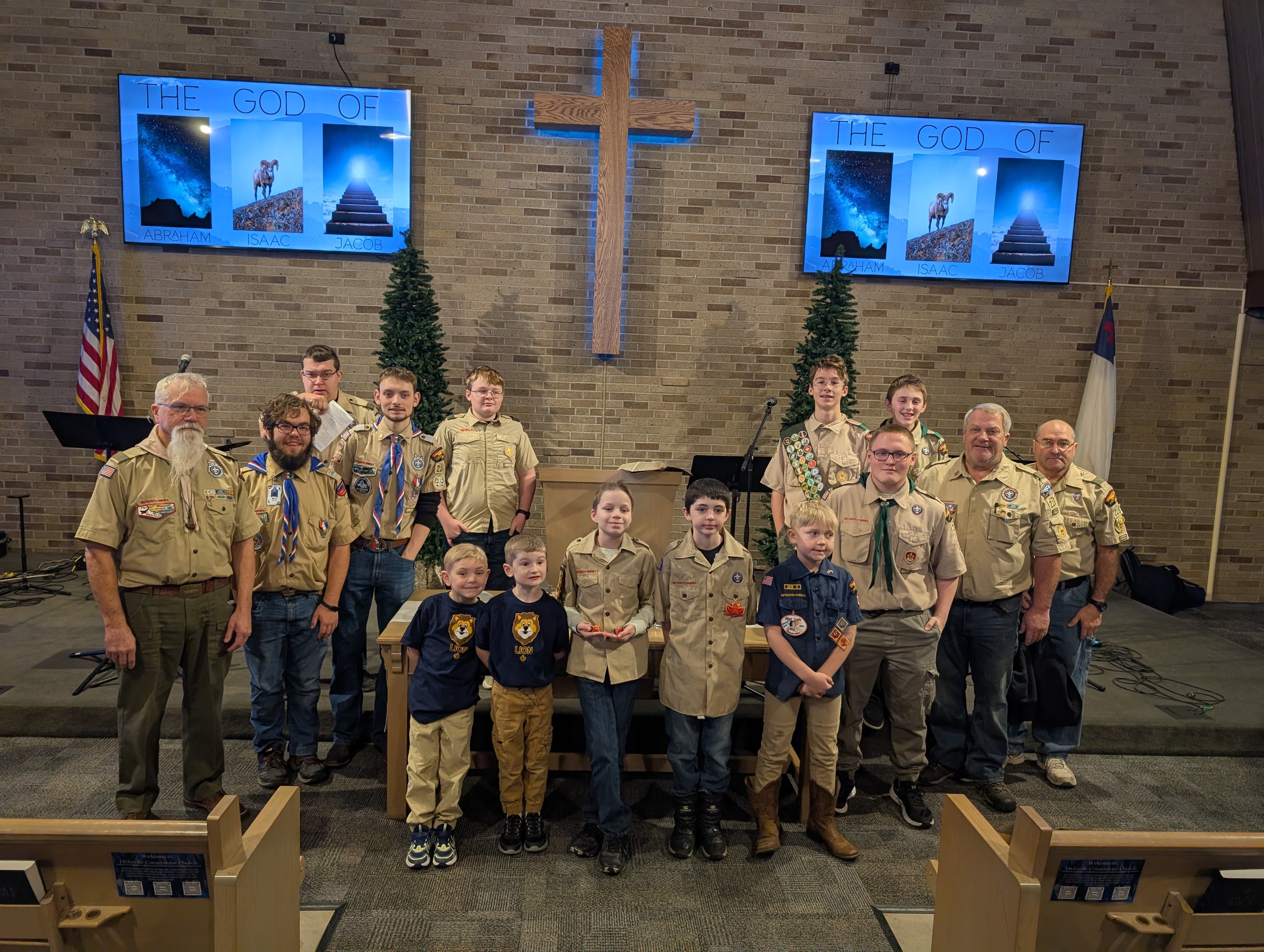 Today is scout Sunday. Scout Sunday is where we all go to church together and normally we go to a different church each year. This year we went to a church we never have been to before. The sermon was pretty good (although I prefer hymns compared to new music but the message is the same). They are working their way thru Genesis. Anywho, it got me thinking... Abram in his 70s left his home blindly trusting God picked up and went no clue how far (at the time) so a land that wascl cursed. The minister stated "What are you willing to give up to come closer to the Glory of God?" Normally at the beginning of the year we are looking to add things to our plate... imagine what we would accomplish if we took something away?? I'm sorry if I rambled it really got me thinking. Also my daughter did not want to be in a picture with all the boys...she's in a girl's only troop in a different town.
