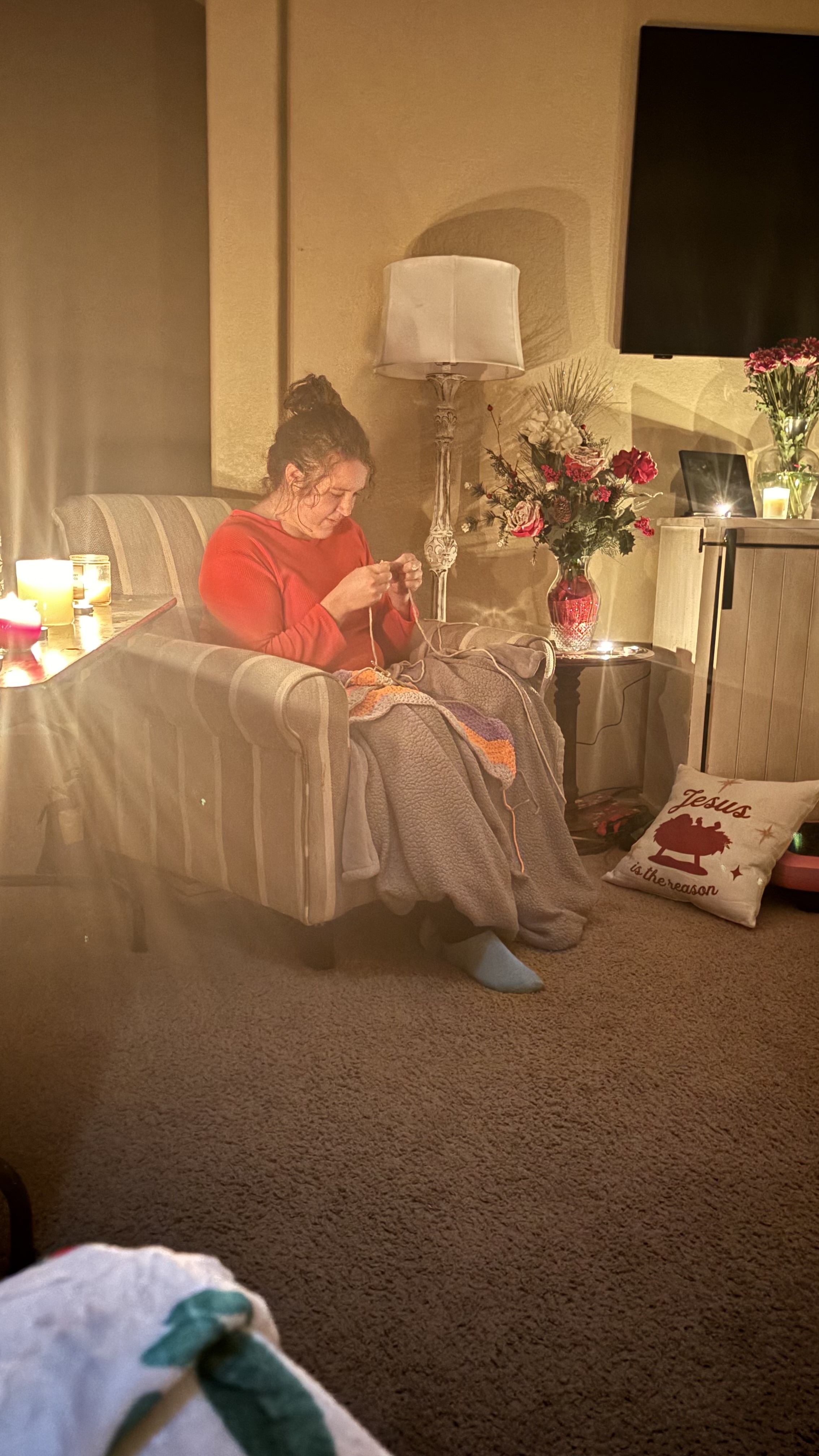 Photo of my daughter crocheting by candlelight tonight.